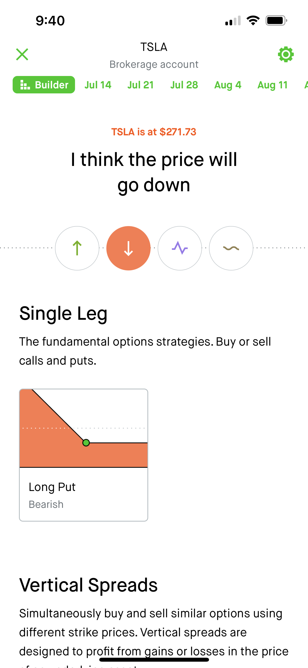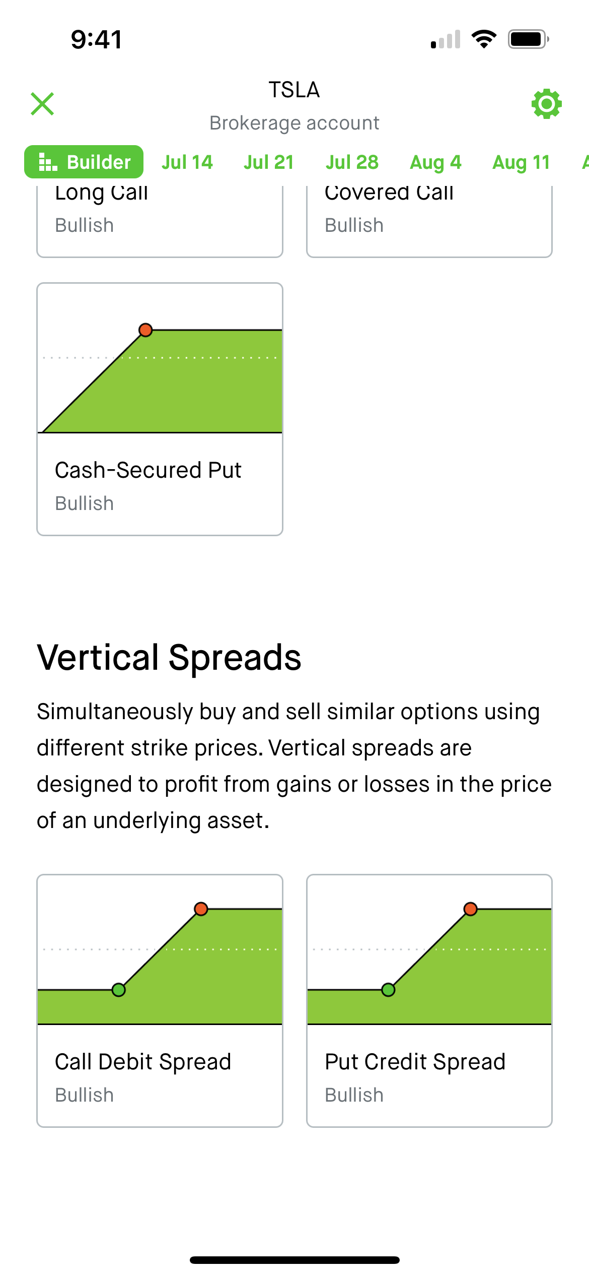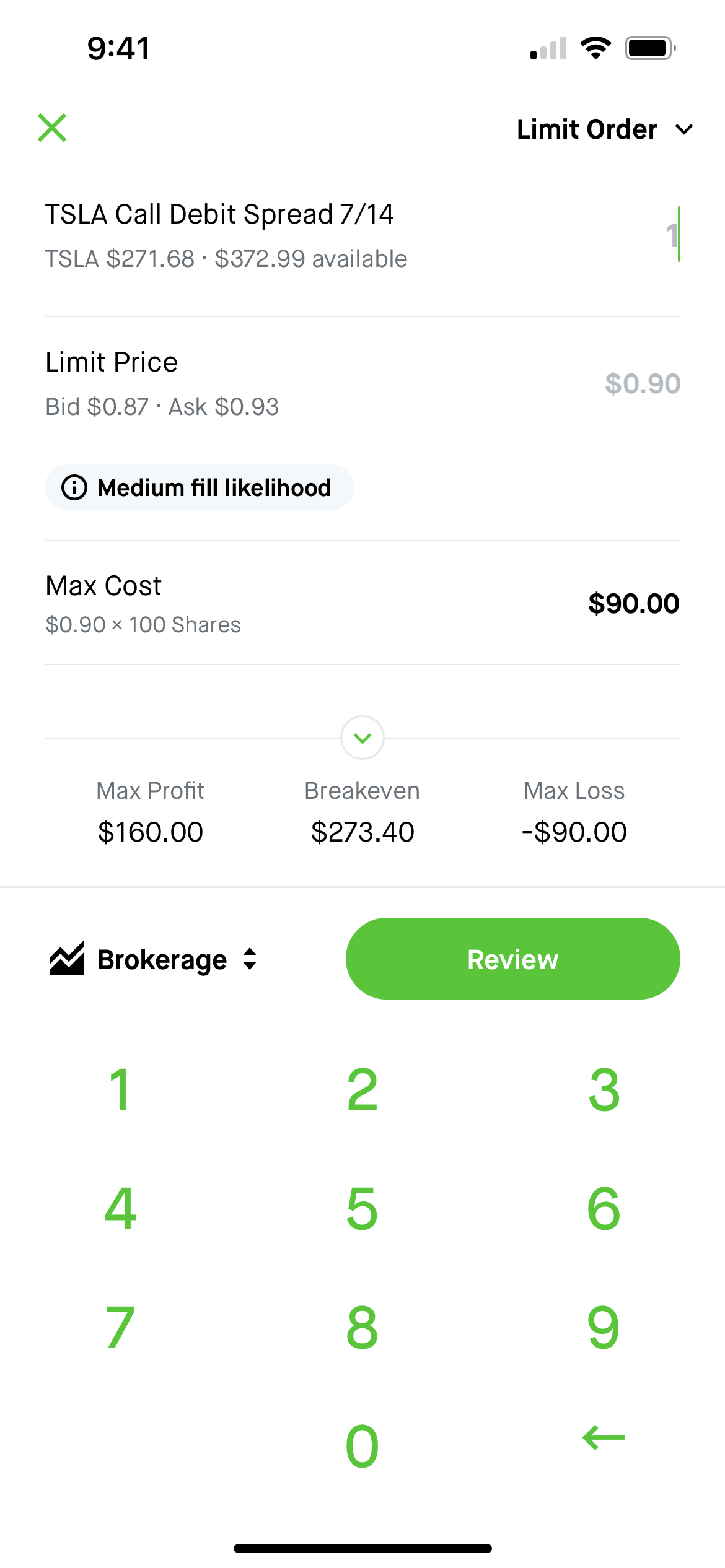 What’s cool about the Robinhood options screen is that it will automatically suggest and build options strategies for you based on what you think the stock price will do. E*Trade does not have comparable options building on the mobile app. Here is an example of building out a vertical call option spread on TSLA: