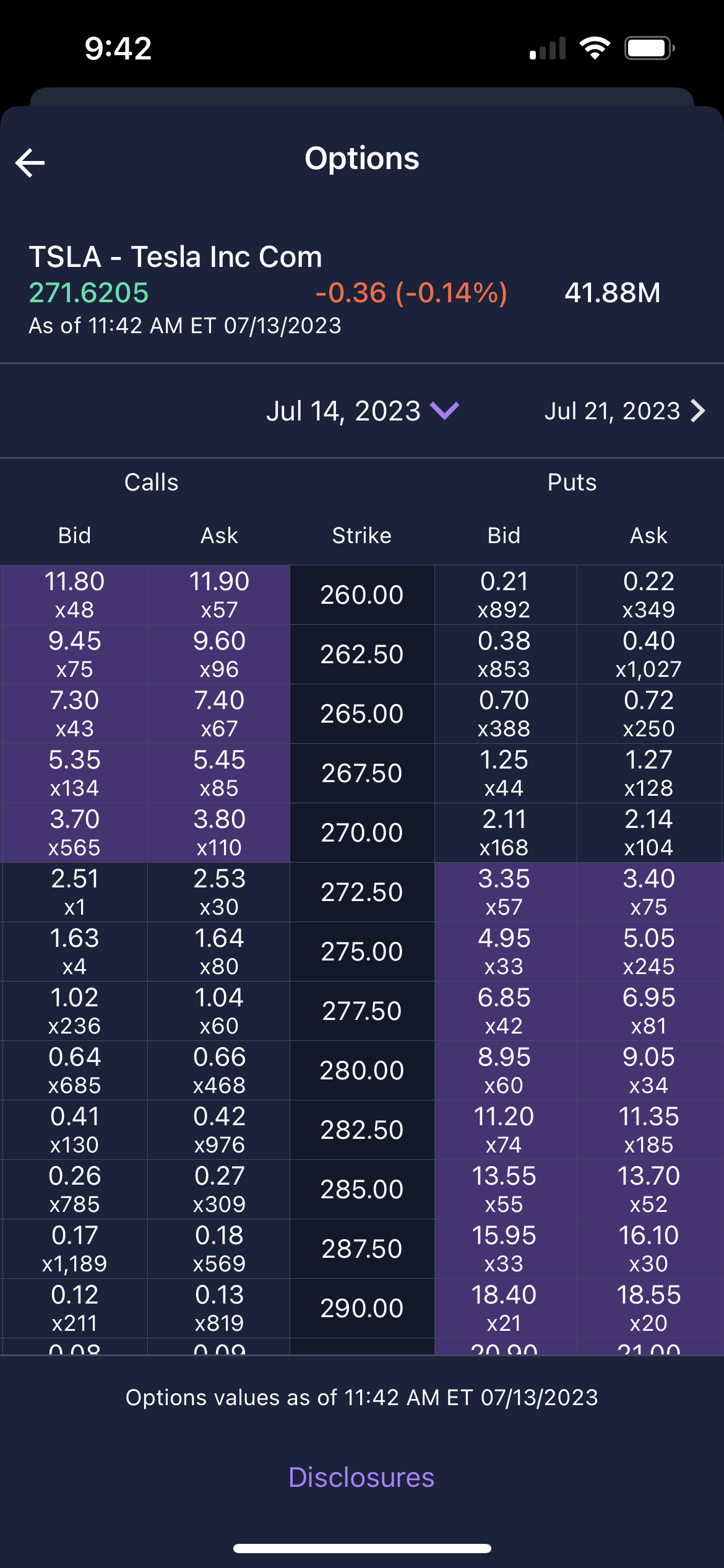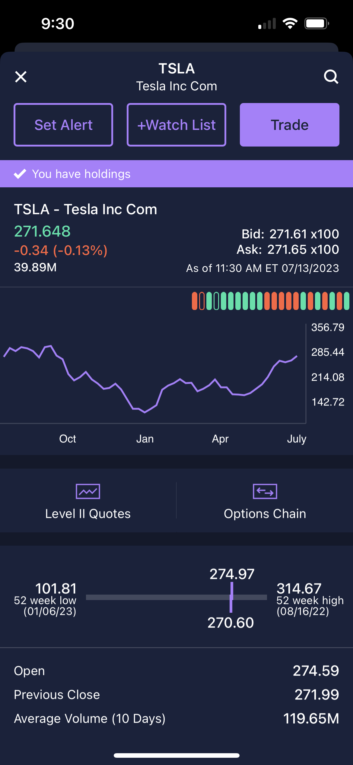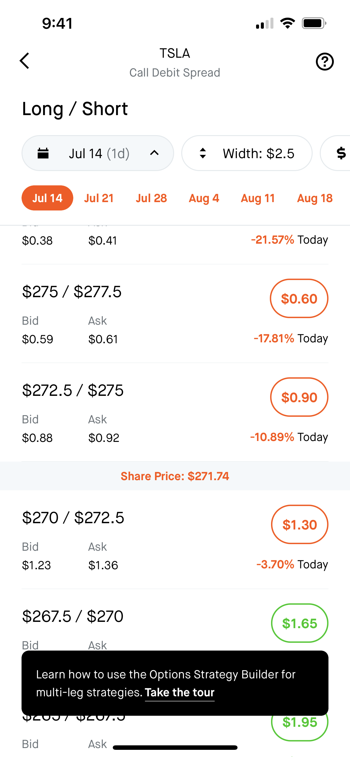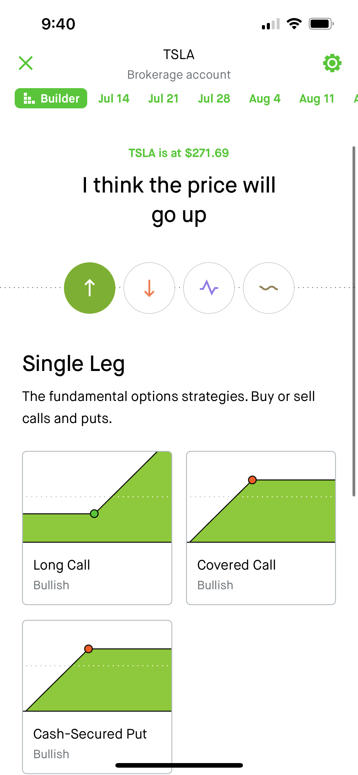 What’s cool about the Robinhood options screen is that it will automatically suggest and build options strategies for you based on what you think the stock price will do. E*Trade does not have comparable options building on the mobile app. Here is an example of building out a vertical call option spread on TSLA: