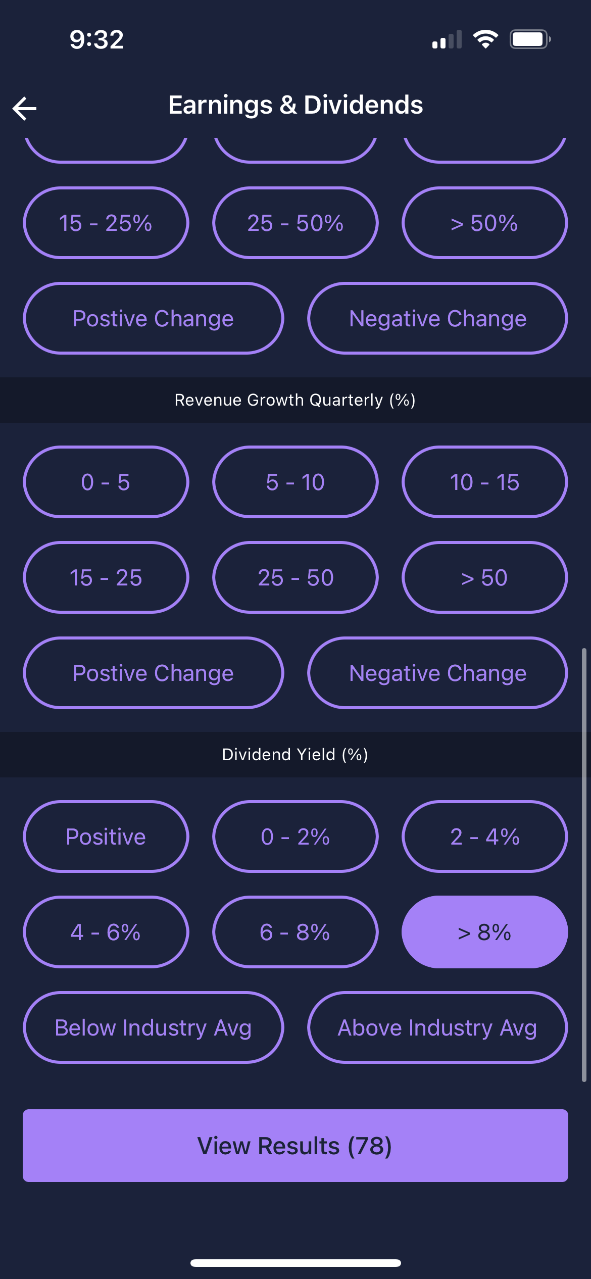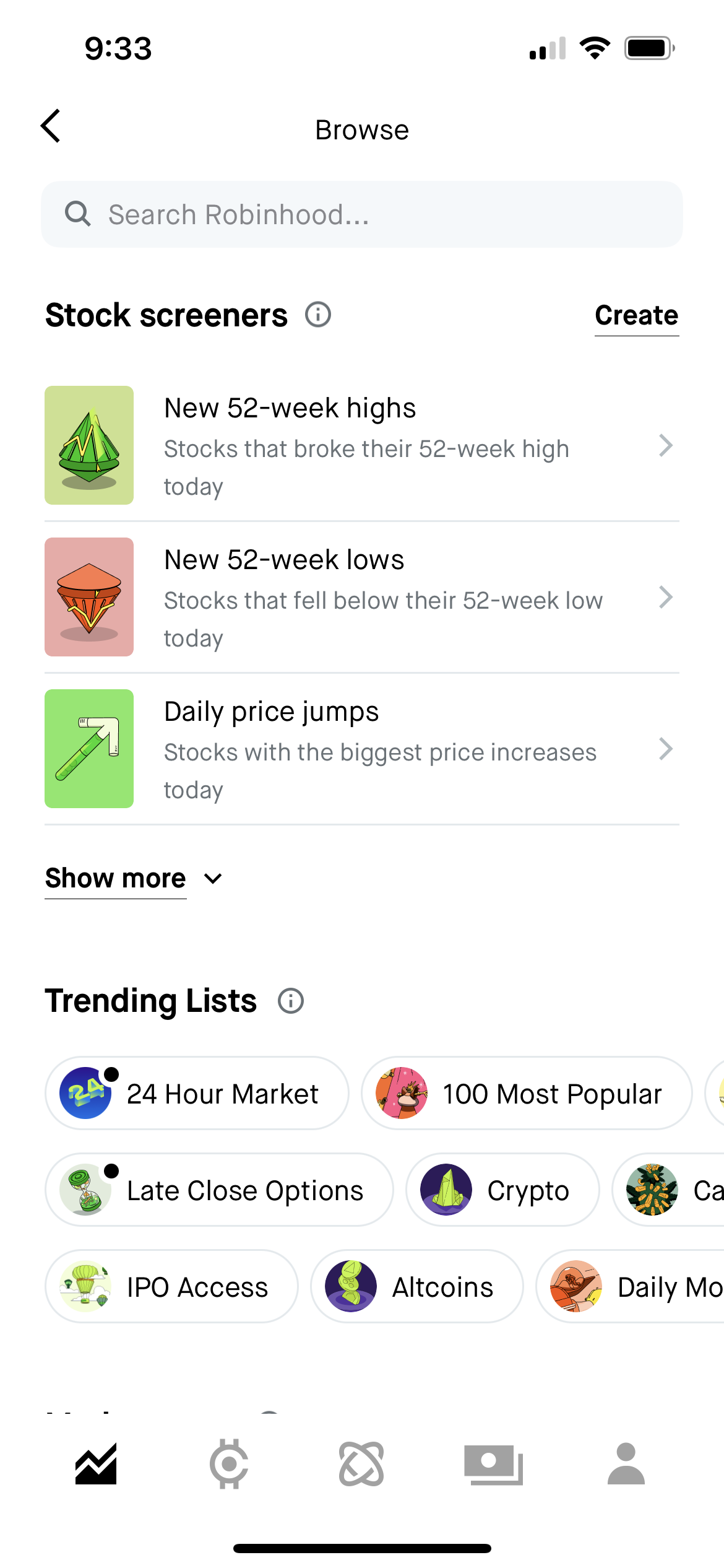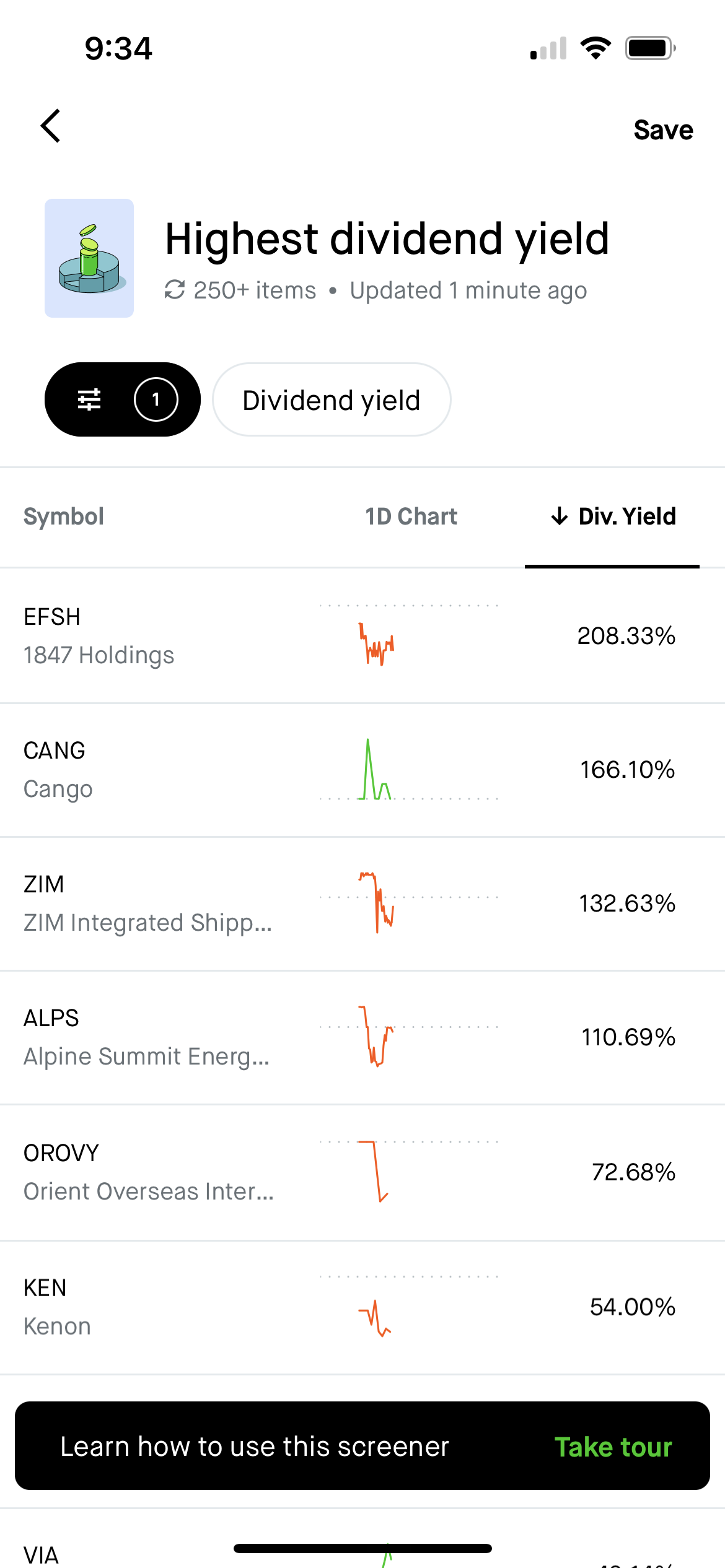 We also really like Robinhood’s stock screens (including pre-built and customizable screens) which offer some unique search categories that we have not seen on other brokerage apps. Here’s the comparison with E*Trade: