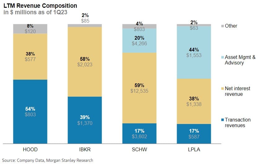Robinhood (and most other online brokers today) does not earn revenue off of trading commissions. But that does not mean that Robinhood does not make money off of stock and options trading. Here is a comparison of the revenue breakdowns for some of the larger brokerages: