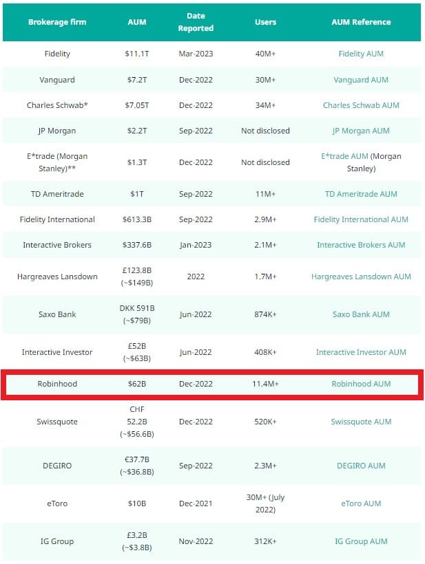 At the outset, it is worth noting that Robinhood is still a tiny player in the global brokerage and asset management business. The chart below compares the assets under management (AUM) of the various brokerage firms: