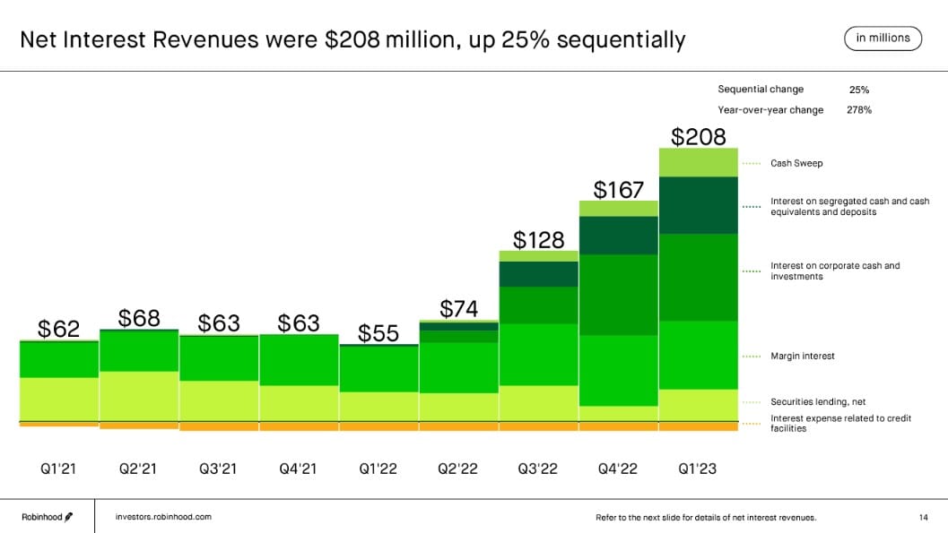 Currently, Robinhood is generating significantly more revenue from sources other than PFOF. Following the substantial rise in interest rates over the last 12 months, net interest income now constitutes almost half of the company’s revenue. As mentioned earlier, the company has around $6bb in corporate cash that it has invested in short-duration interest-bearing assets. Additionally, the company earns a spread (roughly 50 bps) on customer cash. Further, like ordinary brokerage firms, HOOD generates interest income from margin and securities lending. The growth and breakdown of net interest income is shown below: