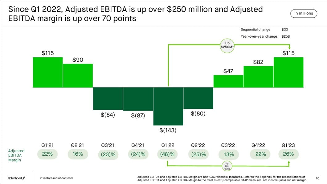 One of the most impressive things we discovered when reviewing HOOD’s financials is the substantial cuts to operating expenses that the company has made in the last few quarters. While most of corporate America continues to pay lip-service to the idea of cost cutting, HOOD is actually doing it, including the company eliminating 1,150 positions over the last two years. This has led to a substantial drop in operating expenses, resulting in a sharp rise ($250mm swing year over year) in quarterly EBITDA: