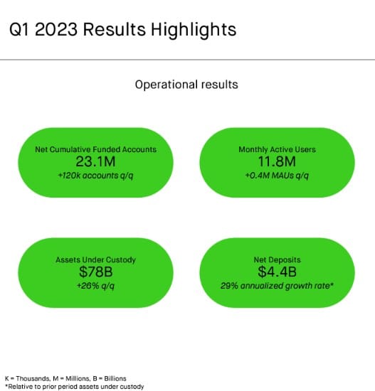 In terms of users, Robinhood has 23.1 million funded accounts and 11.8 million monthly active users (MAU). And while MAUs have dropped off since peaking in Q2 2021, funded accounts continue to grow slightly, and net deposits from customers have continued at an average rate of $1.5bb per month over the last 18 months. The fact that Robinhood has been able to steadily grow funded accounts and net deposits despite a precipitous drop in trading activity following the COVID bubble was quite impressive to us: