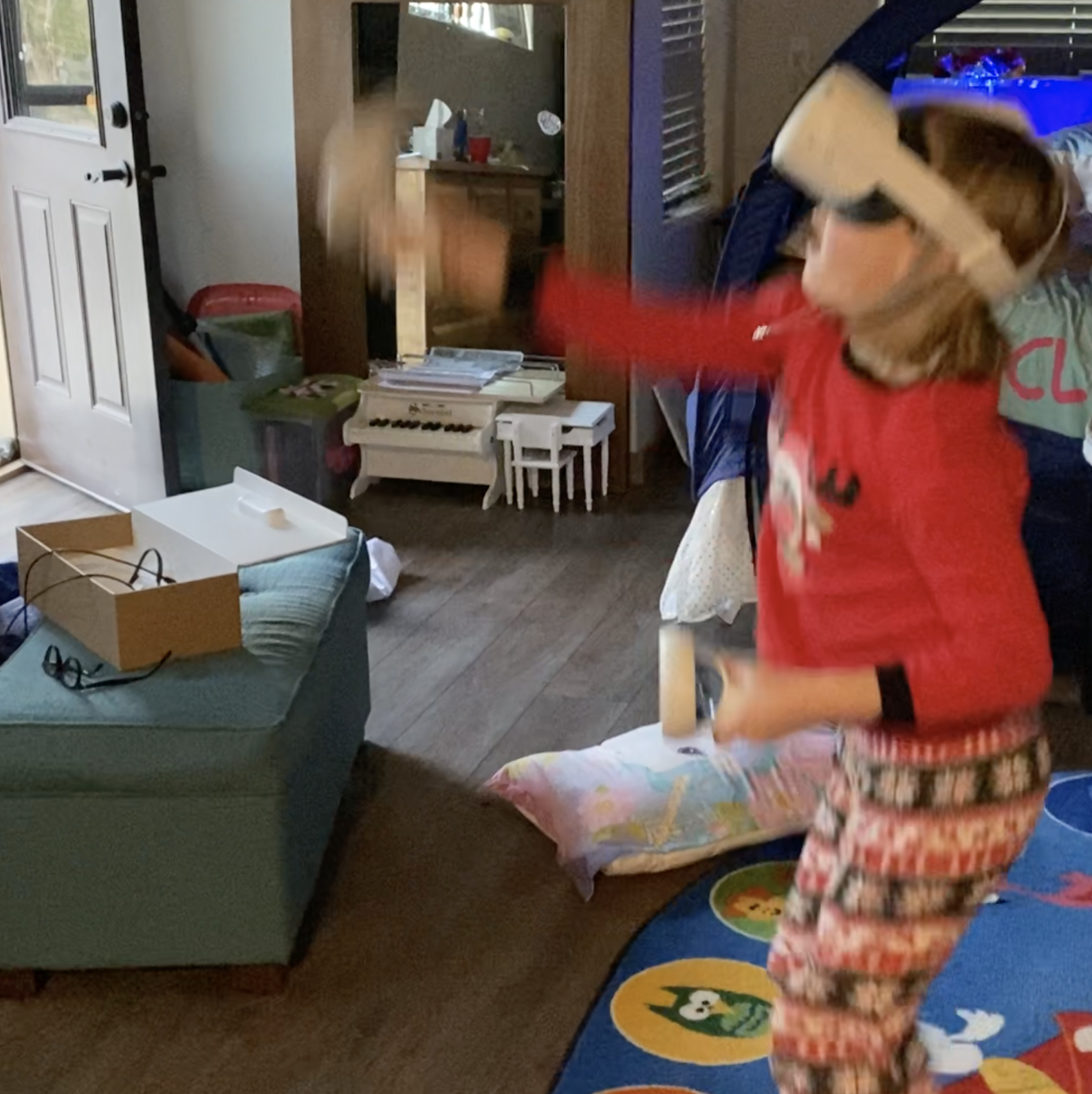 I got an Oculus Quest Virtual Reality headset from Santa. I opened it up, put it on and my mind was blown as the floor seemingly started moving, stars started shooting towards me and the surround sound boomed in my ears. I said “whoa” about fifteen times in the first two minutes. I had my six-year old daughter put it on and she couldn’t believe what she saw either. She started launching handheld rockets into space and hitting a tether ball. My wife joined into the fun, hitting ping pong balls high into the air. Each of us who weren’t wearing the headset and being blown away watched on the screencast on my phone.