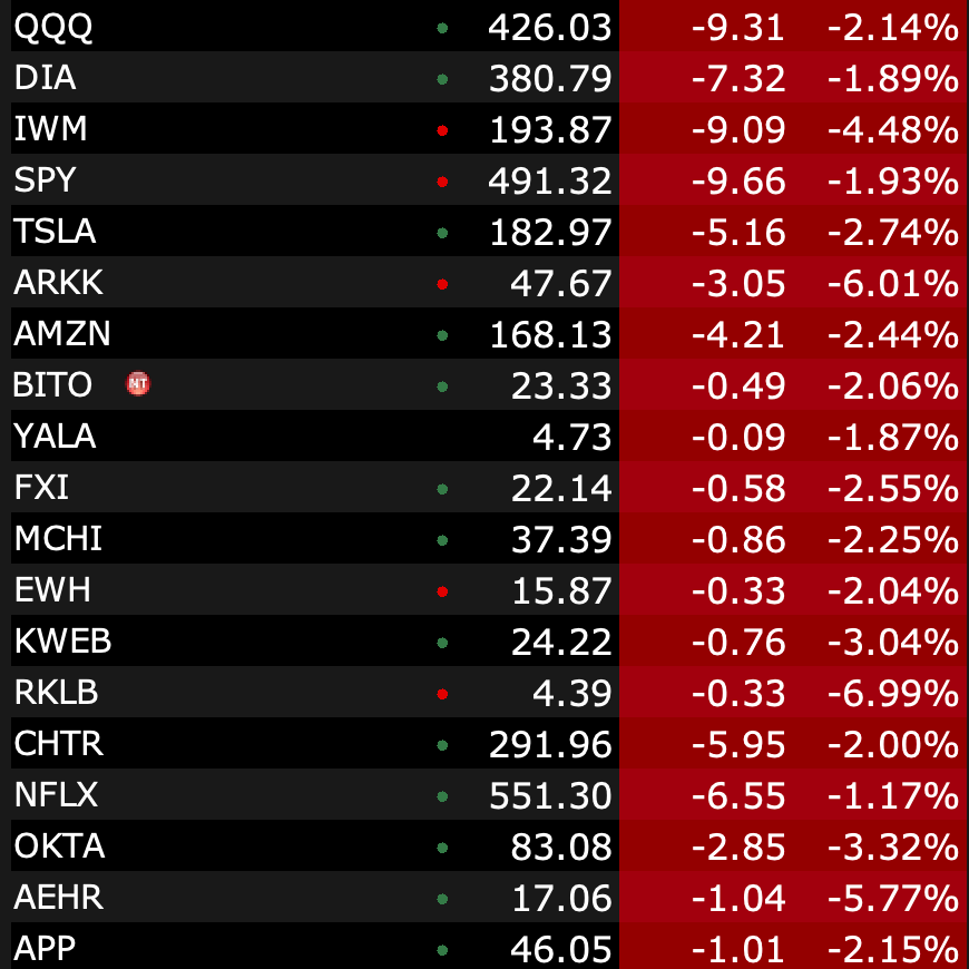Markets are ugly today with the DJIA down about 750 points, the Nasdaq down 2.25%, and the Russell 2000 down nearly 4.5% as of this writing. The breadth of red vs green on the screens is pretty remarkable, as evidenced in the picture of random stocks/ETFs below: