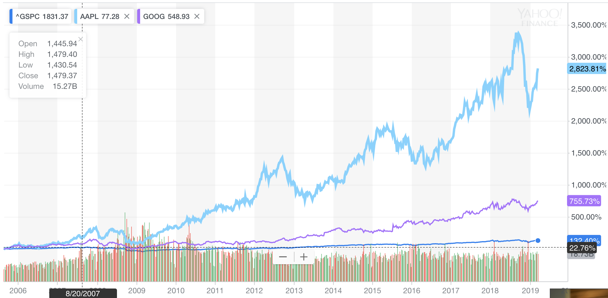 (2019: I guess back in August 2007, I had added some AAPL puts to hedge the AAPL common stock position that I’d held since 2002. I don’t remember the puts, but it was a great idea, even back right before the market crash in 2007, to hold onto core positions in the most Revolutionary companies in the world. I mean, AAPL and GOOG are each up more than 500% from the levels they were at on the day I wrote that in 2007. Apple’s up quite more over that time than Google but both are up much more than the S&P 500: