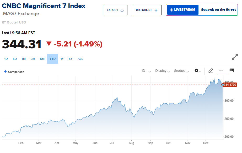Bryce here. 2024 is almost in the books and it turned out to be another incredible year for the markets, and tech stocks in particular. Even with the recent small pullback, the Nasdaq 100 is still up about 27% on the year, and the CNBC Mag 7 Index is up about 72% year to date. Simply incredible.