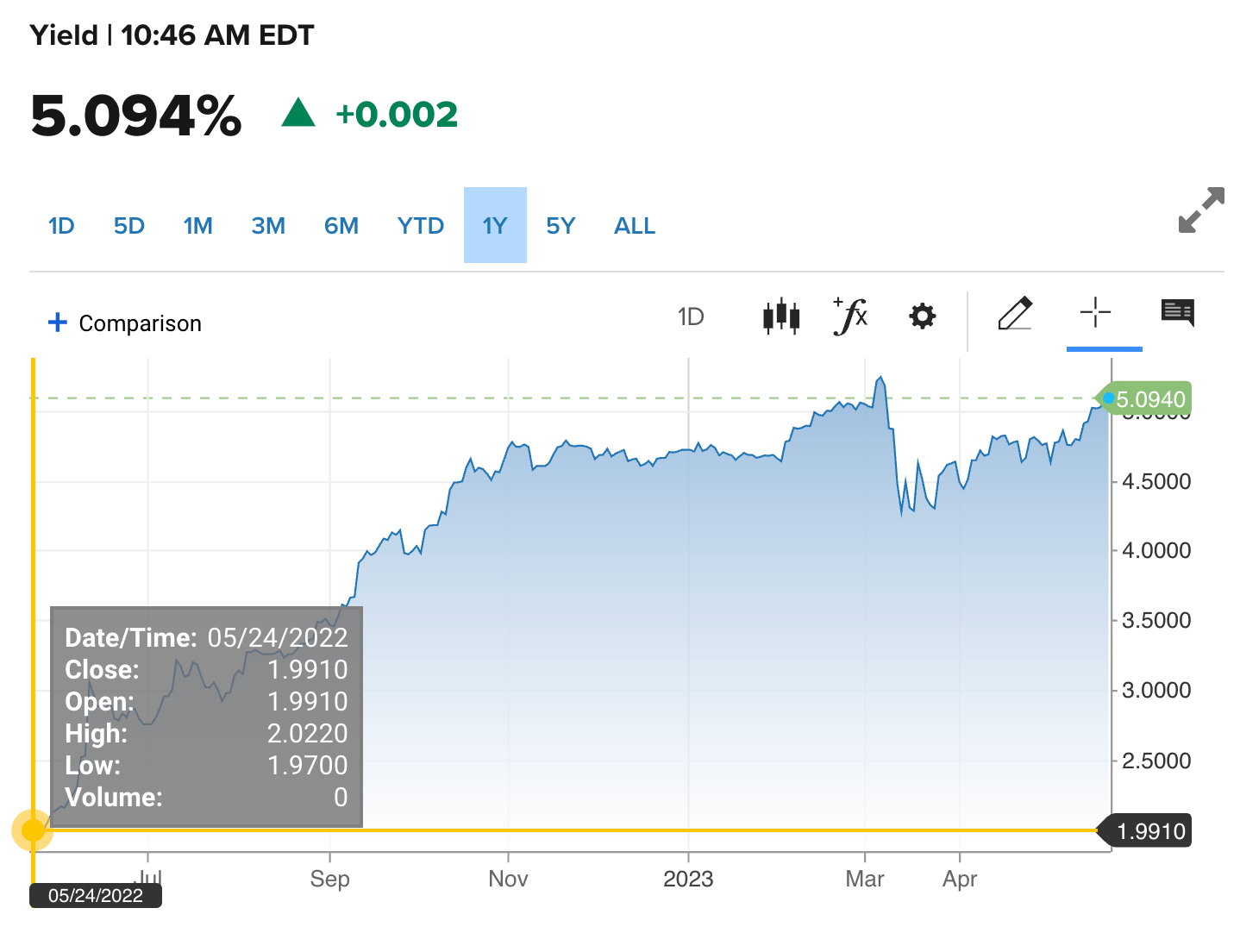 Perhaps the single most troubling problem for the economy and the markets right now is the giant moves that rates have made over the last year or so. 5% yields on Treasuries are an attractive alternative to stock market. Treasuries demand with rates at 5% is probably impacting prices of real estate and corporate bonds and eventually stocks too. Look at these charts of rates moving higher over the last year.