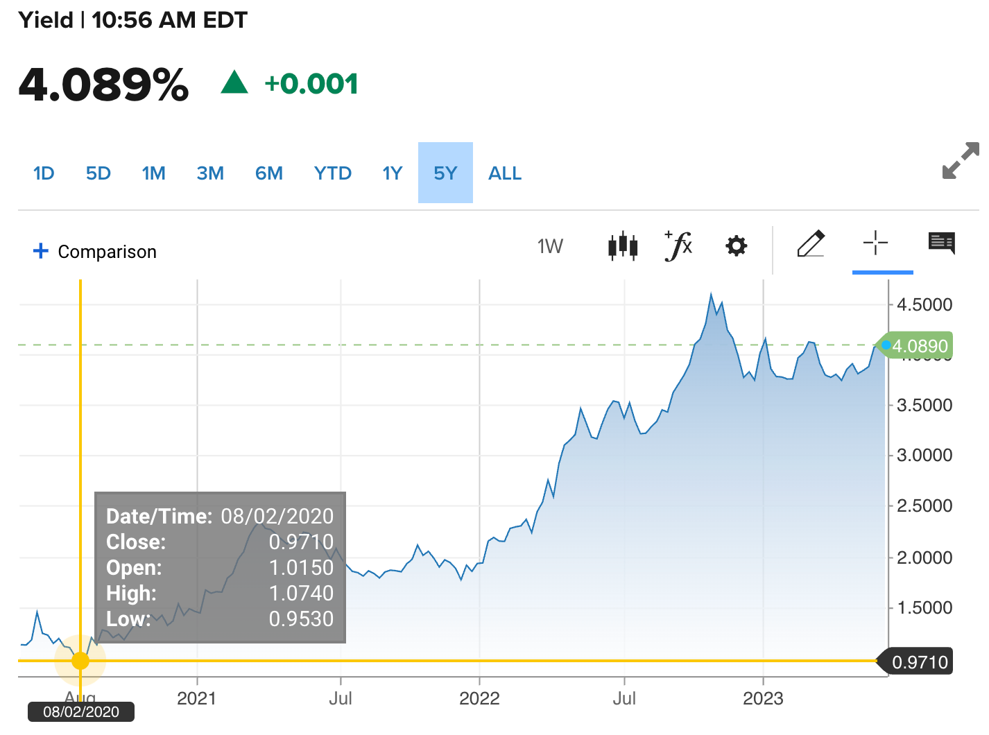And a five year chart of the 20 year Treasury rates is just as shocking:
