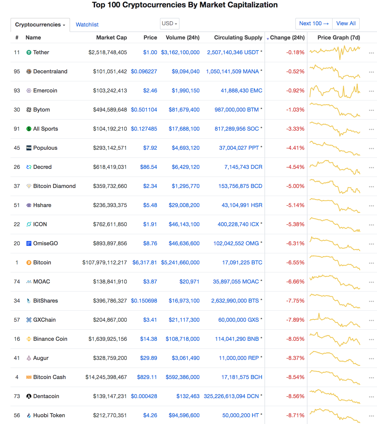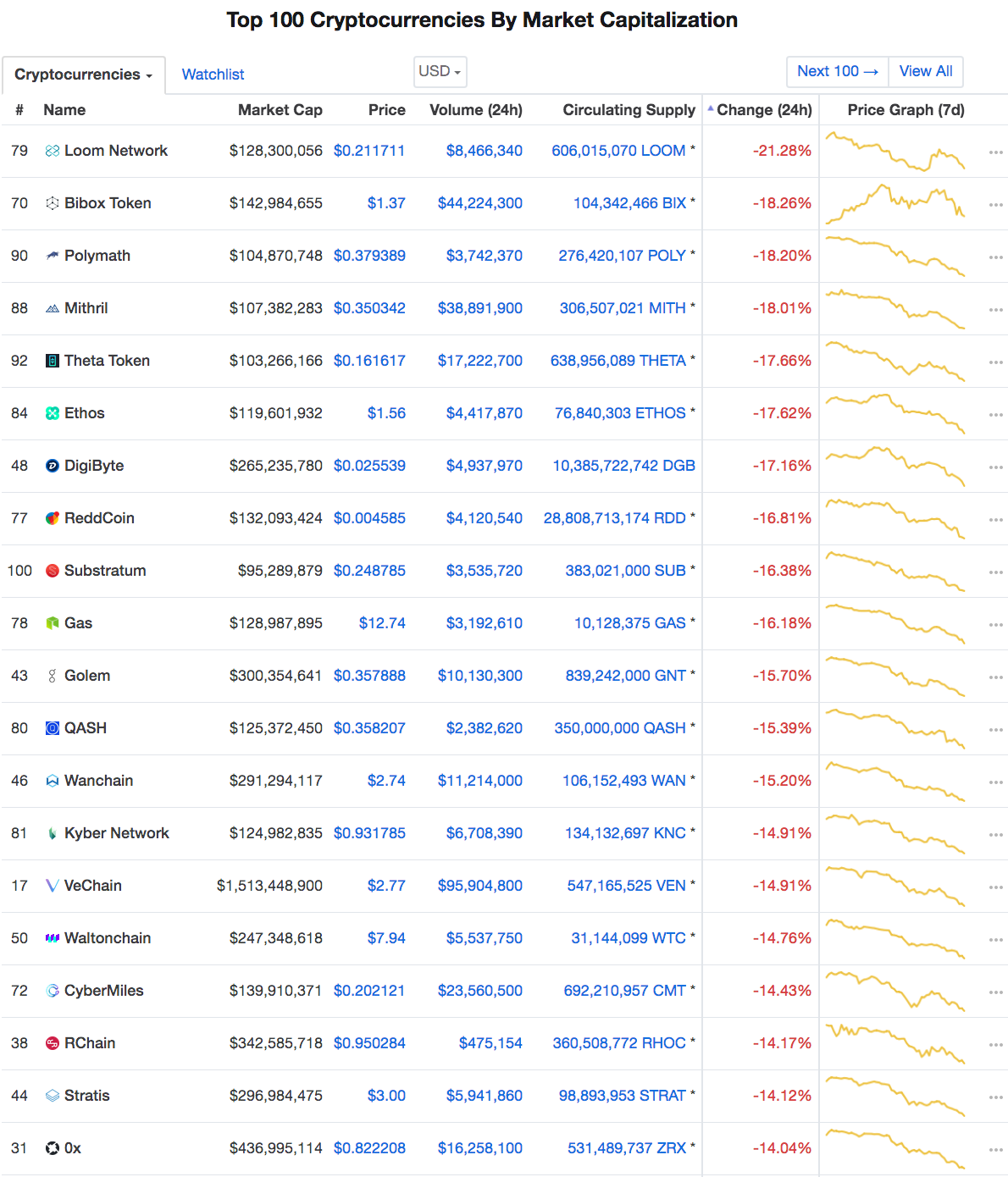And you want to see how ugly it’s gotten today alone? There isn’t a single cryptocurrency in coinmarketcap.com’s “Top 100 Cryptocurrencies by Market Cap” list that is up today. 100 for 100 are down and most are down 10-20% today alone. Take a look. The first image below is a screenshot of that list sorted by biggest winners today and the second is a screenshot of that list sorted by the biggest losers today: