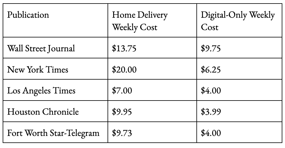 The regular rate for 7-day home delivery is $26.99/week and a digital-only subscription is $11.99/week. For comparison purposes, the full price of digital-only and home-delivery subscriptions from selected publications is shown below: