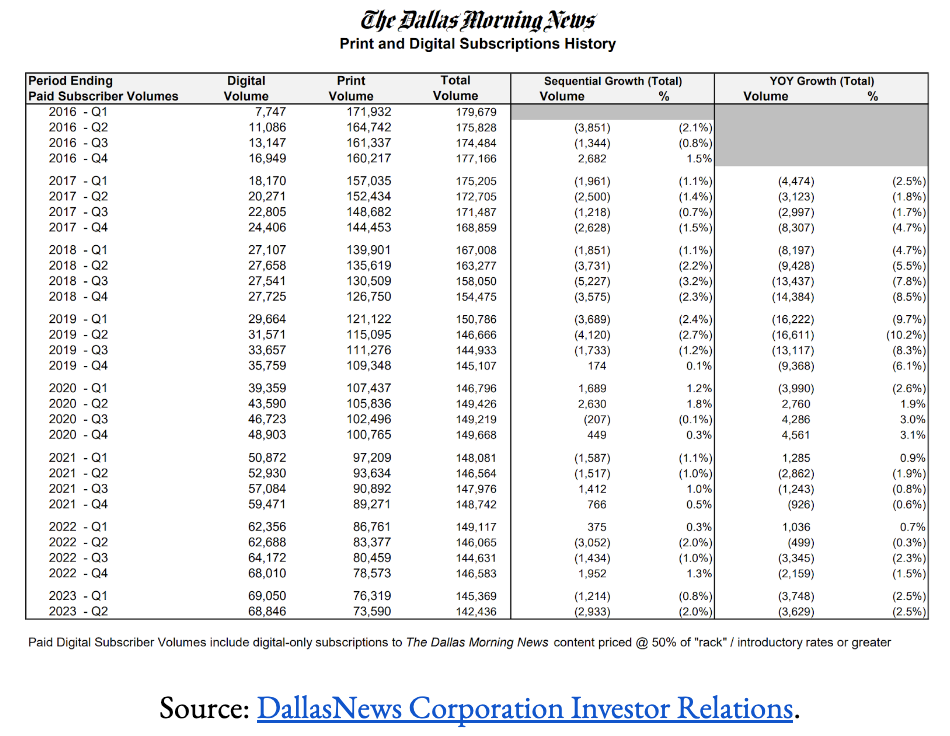 As you might expect, print circulation and the advertising revenue that comes with it have been on the decline in recent years. Since Q1 of 2016, print volumes have dropped 57% from 171,932 to 73,590 subscriptions currently. Accordingly, the company has placed a big focus on growing its more-affordable digital business. Over that same time period, digital subscriptions for the DallasNews have risen nearly 8-fold, from 7,747 in Q1 of 2016 to 68,846 presently.