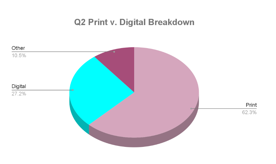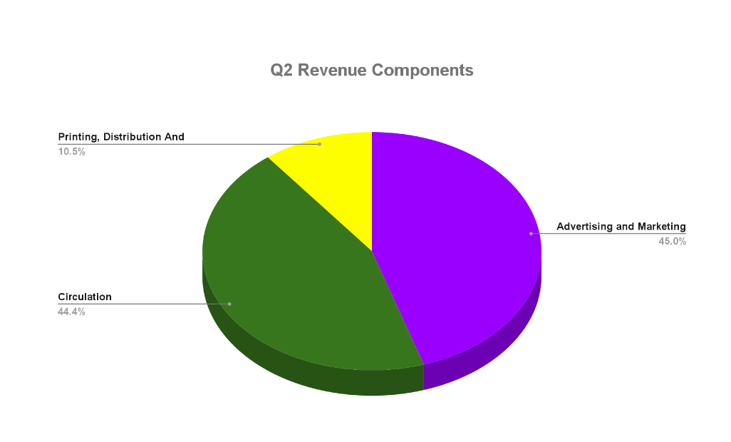 The company’s revenue falls into one of three categories: (1) advertising and marketing services; (2) circulation revenue; and (3) printing, distribution, and other revenue. Revenues generated by Medium Giant, the company’s wholly-owned marketing agency, fall into the first category of revenues. The percentage breakdown of the company’s revenue in the second quarter is shown below: