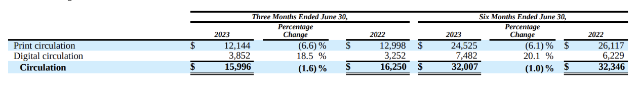 Each business segment includes revenue from both print and digital assets. Despite the substantial growth in digital subscriptions over the last 7 years, combined digital circulation and advertising revenue still only constituted 27% of the company’s total revenue in the second quarter of this year.