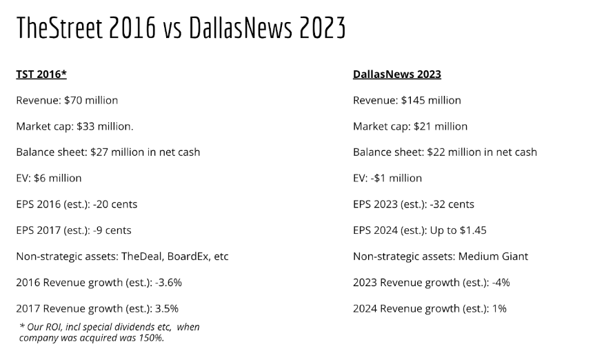 DallasNews offers an even more attractive entry point as TheStreet.com was not trading at less than cash when we bought it. Additionally, DallasNews is trading at 0.15x sales compared to TheStreet.com trading at just under 0.5x sales. Nobody wanted to touch TheStreet.com when we started buying it and then it ended up being acquired by another media company. DallasNews is giving us a similar setup at an even more attractive valuation. Additionally, DallasNews has the advantage of covering a red-hot metropolitan area whereas TheStreet.com was competing with SeekingAlpha.com, Bloomberg, WSJ, and hundreds of other financial media companies competing for the same audience of retail-ish traders and investors. We think TheStreet.com gives us a good model for what this trade should look like, but frankly the potential upside here is much higher than what we were looking for when we went into TST.