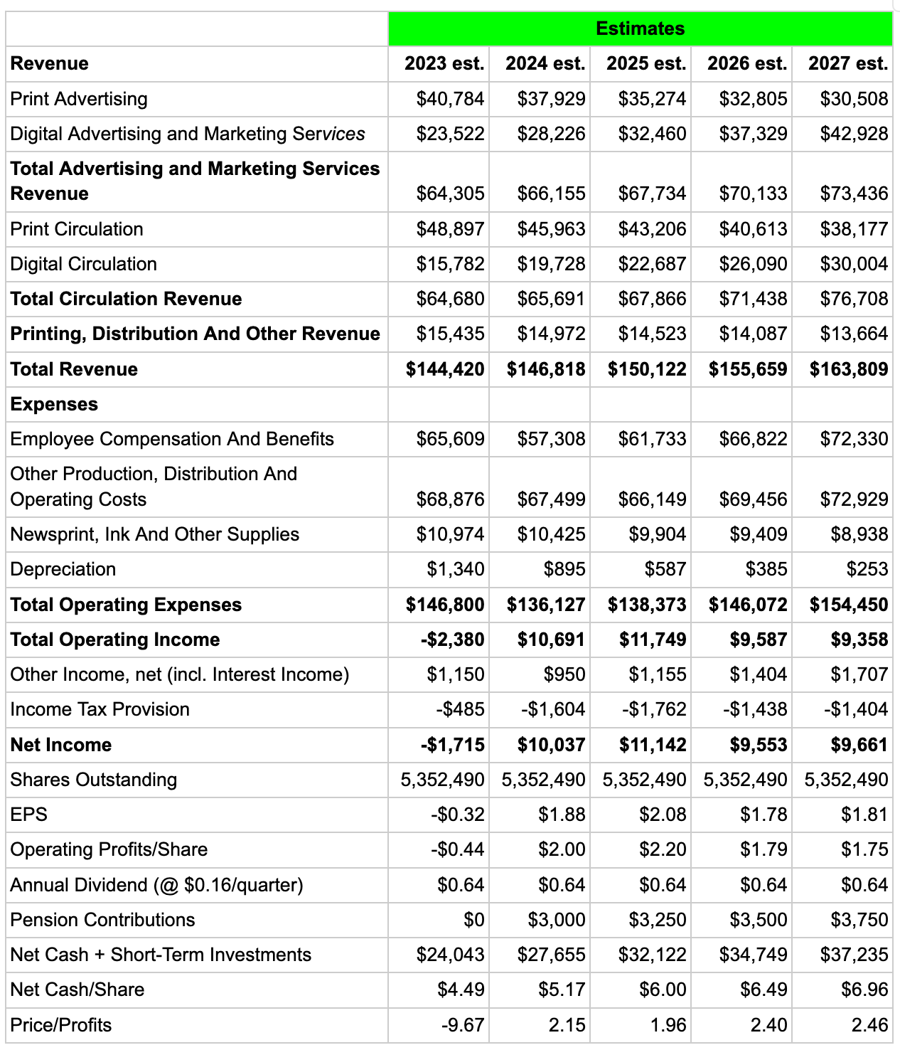 In our model, we assume that the traditional print advertising and circulation businesses continue to decline at about 5-7% per year. We model digital advertising revenues returning to 18-20% growth commensurate with the growth DallasNews has been seeing with its digital circulation revenue. Meanwhile, we model employee compensation dropping over the next two years as the company continues to trim headcount. In sum, we think the company could reasonably return to 2-5% topline growth for the next 4-5 years while expenses are reduced. Since the company is already operating close to breakeven, even a slight improvement in operating margins will produce a big earnings yield for shareholders. As shown below, we model DallasNews kicking out $2/share in earnings as soon as 2024 with what we see as very reasonable changes to the current operating structure.