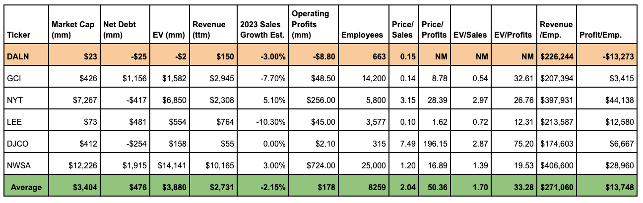 We ran a comparison of DallasNews to some comparable companies in the print media business (Gannett, Lee, Daily Journal) as well as to market leaders like NYT and NewsCorp (DowJones, WSJ parent). DallasNews is clearly trading at a big discount on a price/sales metric (0.15), and with a negative enterprise value, the business itself is essentially priced by the market at $0. We would also mention that there is obviously improvement to be had on the profitability front as DALN is the only company that is running at an operating loss. Although we are cognizant of the struggles in the print media business, clearly there are steps that could be taken at DallasNews to bring it in-line with its peers on an operating basis. Both NYT and NWSA are expected to grow in the mid- to low- single digits this year having somewhat successfully made the transition to becoming digital platforms. We see both the revenue and profit goals as attainable, thus opening up major opportunities for the company and its shareholders going forward.