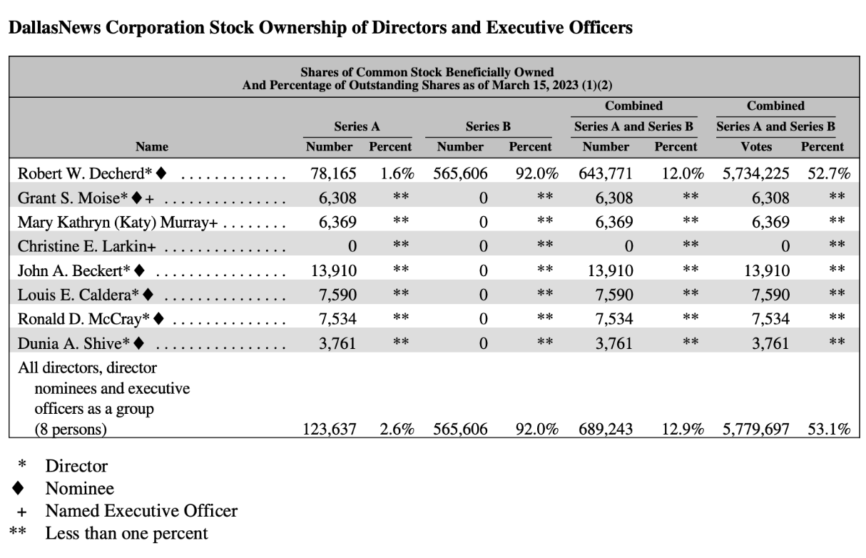 DallasNews went public in 1981 but the Dechard family has maintained effective control over the organization since purchasing a majority interest from A.H. Belo in 1926. The ownership of the company as of its last shareholder meeting is shown below: