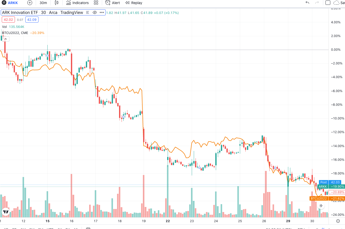 Now, that’s a real sell-off, at least in the tech stocks and crypto worlds. This is what ARKK and bitcoin being down 20% over just a three week period chart looks like this: