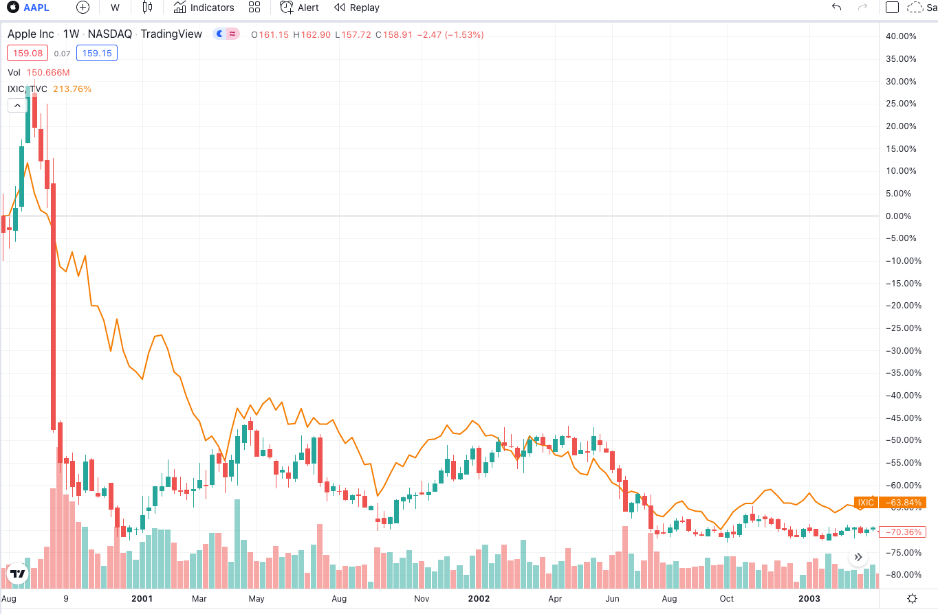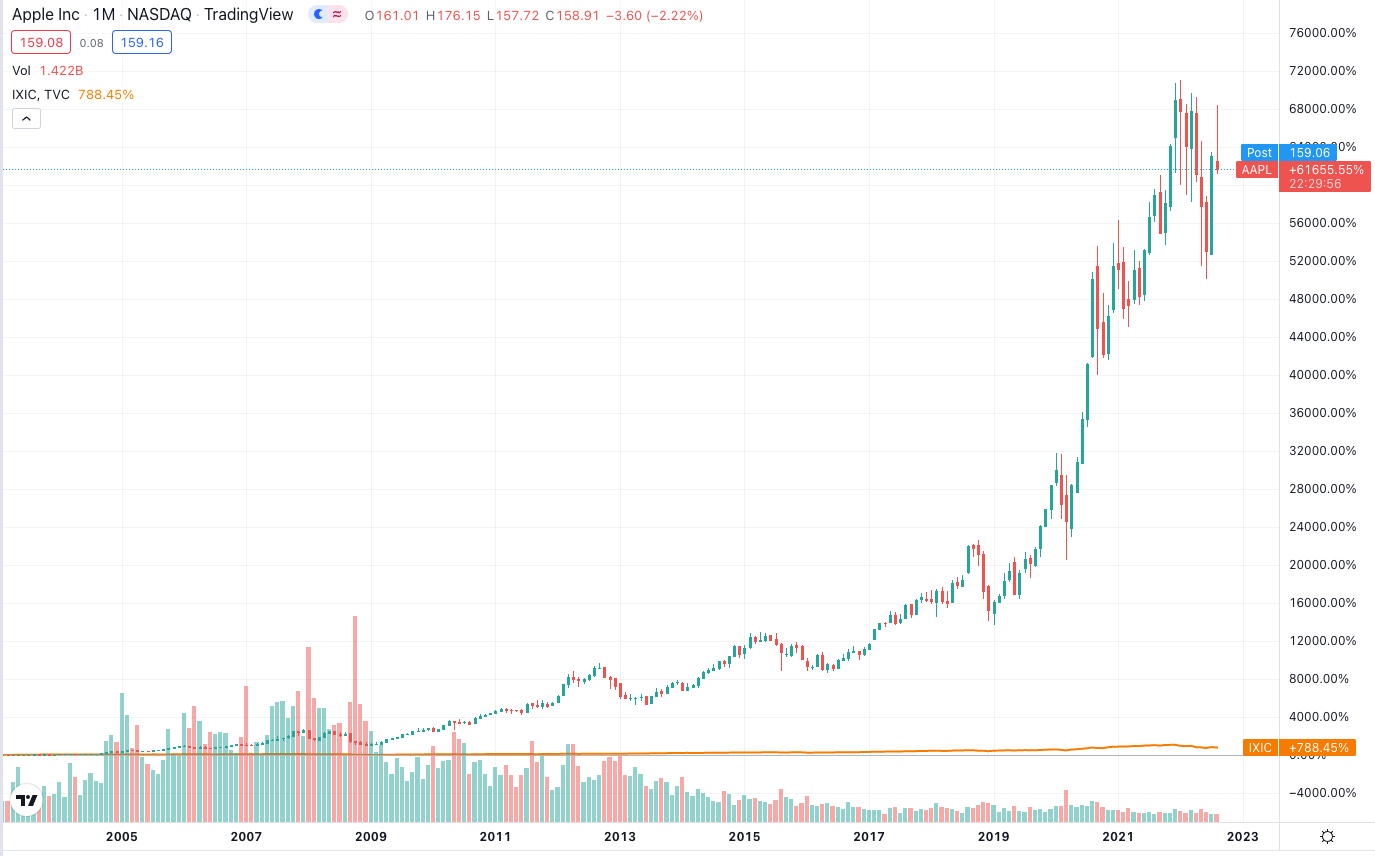 And here’s what Apple and Nasdaq’s respective charts have done since March 2003. That flat-looking orange line along the bottom is the Nasdaq’s chart which went up almost 800% since March 2003, which is pretty good performance. But not compared to Apple’s almost 62,000% return over the same time frame: