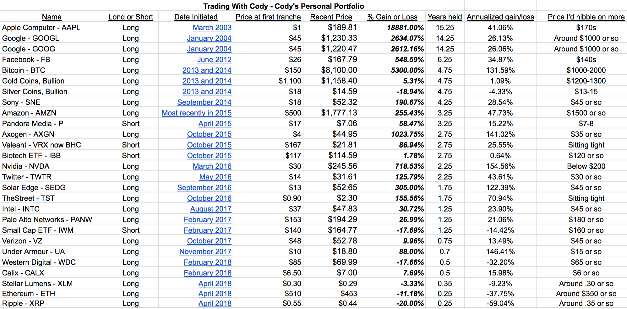 Here’s a list of “Where I’d buy more of each of our positions.” There’s a hyperlink on the “Date Initiated” column for each of the positions so that you can easily go back and read my original posts on TheStreet, The Financial Times, WSJ, Marketwatch and Trading With Cody, even as far back as a decade and a half ago for Apple and Google.