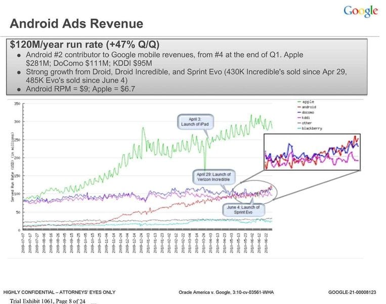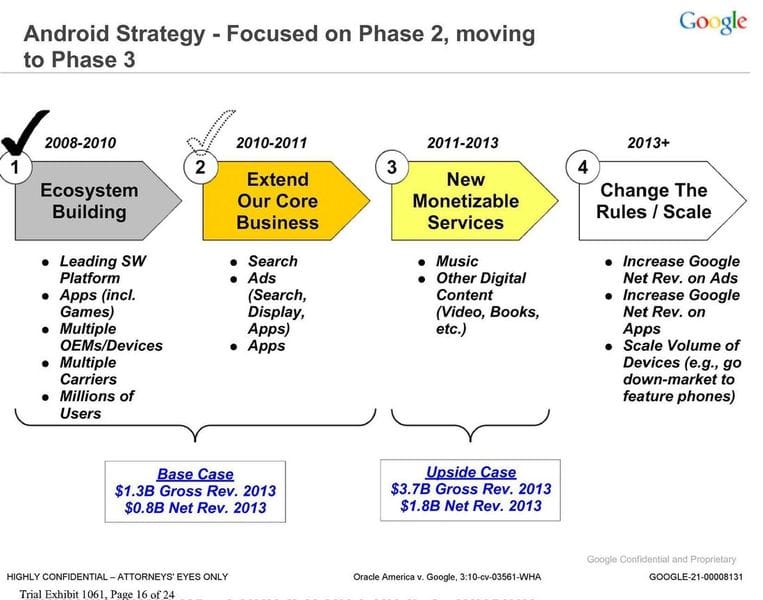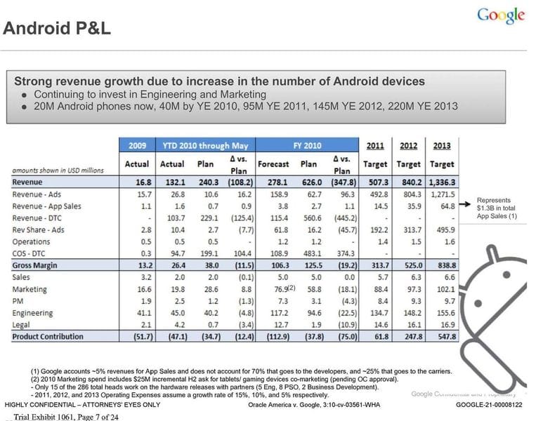 Just how fast Google is getting there is $300 billion question. Android’s revenues have never really been broken out but we have a glimpse into the business thanks to a patent dispute with Oracle. Here are some internal slides that are now public because of the dispute that Andy Rubin, Google’s Android wunderkind, discussed with his lieutenants: