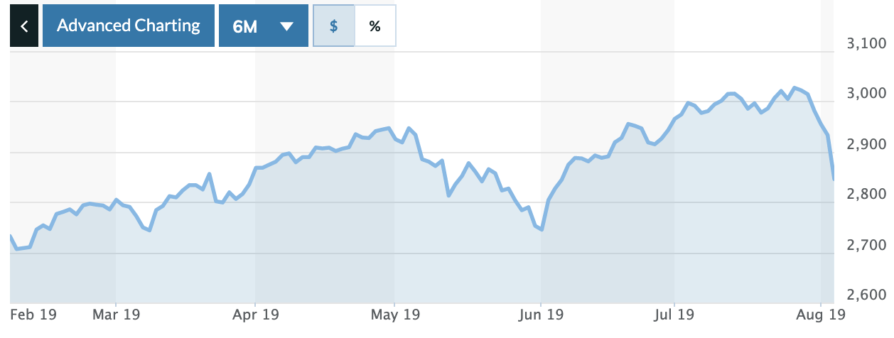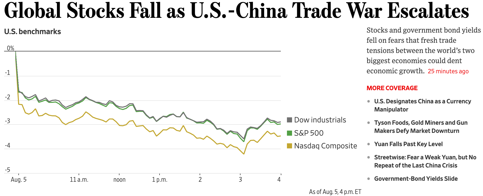 The stock markets were down big today because: Trump China Trade War, tariffs, Yuan devaluation, suspension of Chinese imports of US agriculture, Hong Kong societal meltdown, Yield curve inversion, the Fed didn’t only cut 25 bps, negative interest rates in Germany, Asian stocks collapsing, Japan South Korea trade war, overvaluations, bad technicals…I’m sure I’ve missed a few headlines but you get the gist. There are a confluence of factors at which to point to explain the market’s sudden panicky sell off over the last week.
