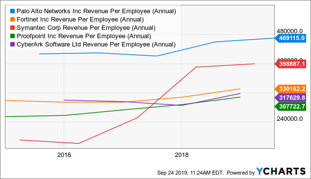 - Palo Alto Networks (7) – Palo Alto’s market cap of $20 billion makes it probably the largest pure-play cybersecurity company. The company will likely do $4 billion in revenue next year, which means it’s trading at a reasonable 5x sales. 20% topline growth ain’t nothing to sneeze at, nor is the amount of revenue per employee that the company generates: