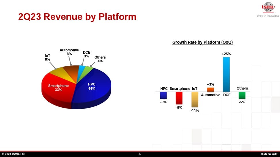 - TSM Taiwan Semiconductor (6+) – Taiwan Semiconductor’s revenue was down 10% and earnings were down 23% YoY in Q2 despite Nvidia’s meteoric rise in the same period. Perhaps most baffling, TSM’s high-performance computing (HPC) segment was down 5% YoY despite truly unprecedented demand from Nvidia. The only segments that were up this quarter were Automotive (up 3% YoY) and Direct Consumer Electronics (up 25% YoY) (DCE makes chips for smart TVs, User Interfaces, etc). It turns out that the historic demand for Nvidia chips was not enough to offset the declines TSM saw in the demand for smartphone chips and the other advanced chips it makes for companies like Apple, AMD, Qualcomm, Broadcom, etc. Semiconductor stocks have been on fire most of this year and we think that TSM is telling us that there is some weakness across the sector that is probably not yet priced into the stock prices of most of the fabless semis. TSM did say that it expects most of its growth for the next few years to come from HPC and is still planning on spending over $30bb this year on capital expenditures. We’ve been in this stock for years and from much lower levels because of TSMC’s monopoly status in the advanced semiconductor manufacturing business, we still want to own this stock for the long term but we won’t be looking to buy more unless we see a decent drop from here. We would be buyers of more around $85.
