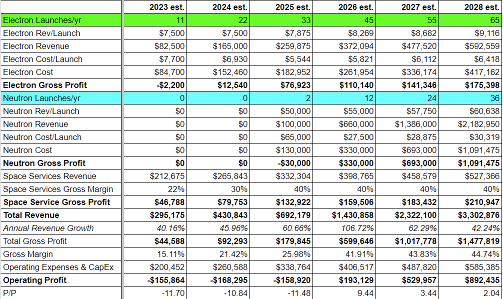 - RKLB Rocket Lab (6+) — Rocketlab had a major setback this quarter when one of its Electron launches exploded shortly after takeoff. This was Rocketlab’s first failure in over two years and after 20 successful launches in a row. Despite the failure, Rocketlab was able to quickly diagnose the issue and less than one month later it received FAA approval to begin launches again. We were frankly astonished that Rocketlab was able to get government approval this quickly and hats off to Peter Beck and team for pulling off what we thought could take 2-3 months minimum in only 25 days. That said, this failure definitely set Rocketlab back in its efforts to increase launch cadence and we have adjusted our financial model accordingly. We now model Rocketlab completing 11 Electron launches this year (down from 15) and 22 launches next year (down from 24). We also reduced the cadence growth significantly through 2028 including cutting the planned Neutron launches from 24 to 12 in 2026. As shown below, the company now has a 9.4 P/P in 2026 and it could get down to 2 P/P in 2028 if everything goes right for the company. This is an attractive valuation 5 years out but it mainly hinges on the success of Neutron, its next-generation rocket, which is much larger than its current rocket and will bring in $50 million per launch compared to $7.5 million for its current launches. From the conference call it sounds like Neutron development is going well but we think it is more likely than not that Rocketlab will have to raise cash to get Neutron deployed. But since Rocketlab is the only company in the US besides SpaceX (and one of the few in the world) that can regularly launch satellites into orbit, it should be able to raise cash on better terms than most startups. We trimmed some Rocketlab this year but are holding tight on a medium-sized position in it for now.