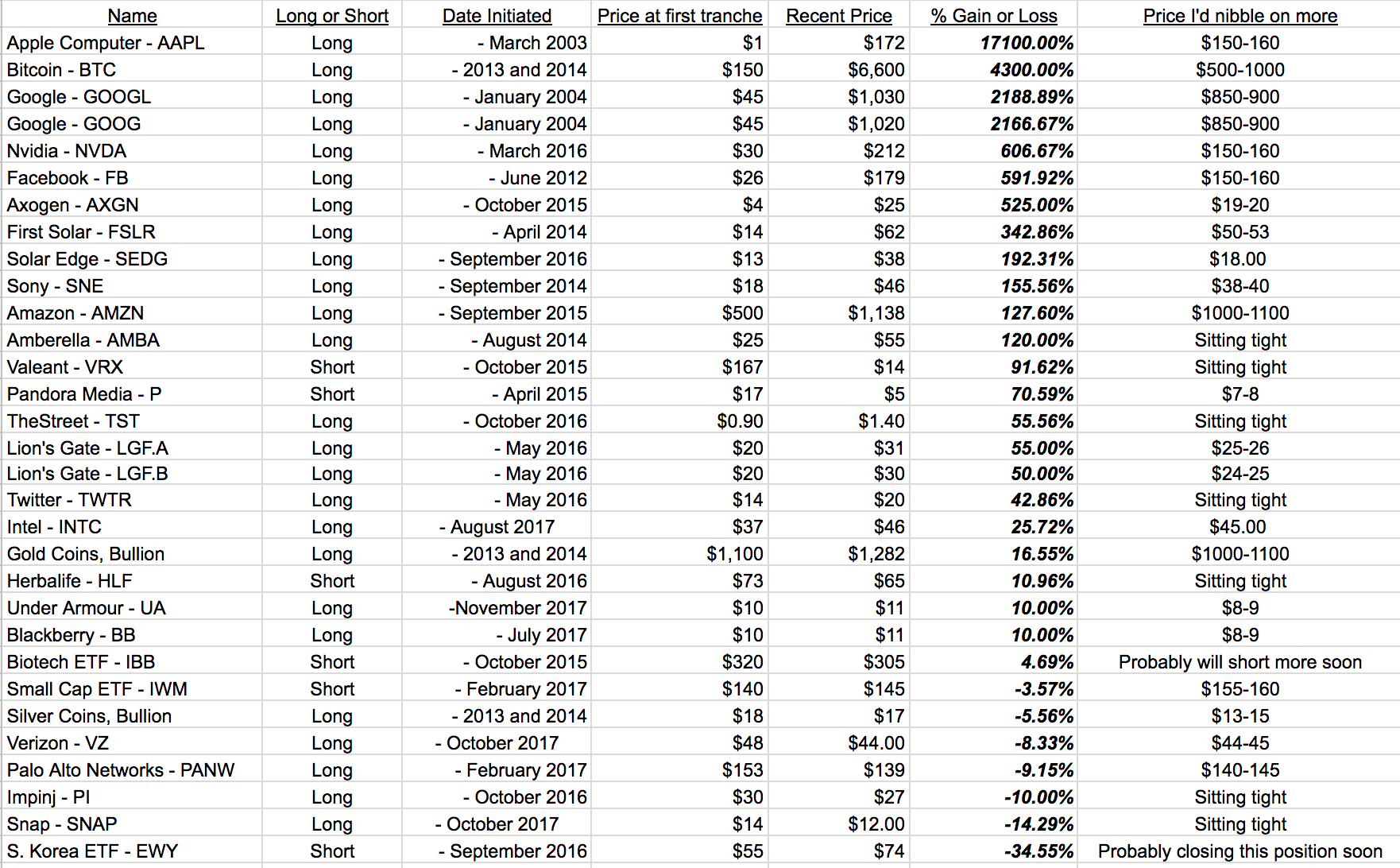 | Name | Long or Short | Date Initiated | Price at first tranche | Recent Price | % Gain or Loss | Price I’d nibble on more |