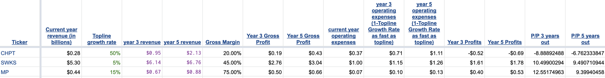 A. “Cody-Bat-Computer” is a funny and clever name for my spreadsheet algorithms. Now help me with a better name for “The Redomestication Of The Supply Chain Revolution”, please. As for CHPT, I’m afraid my model, even making some optimistic assumptions, doesn’t show the company ever getting profitable in the next five years. Here’s a screenshot of the three stocks I ran through my algo’s today: /content/images/wp-content/uploads/2022/07/screen-shot-2022-07-22-at-12.23.01-pm.png