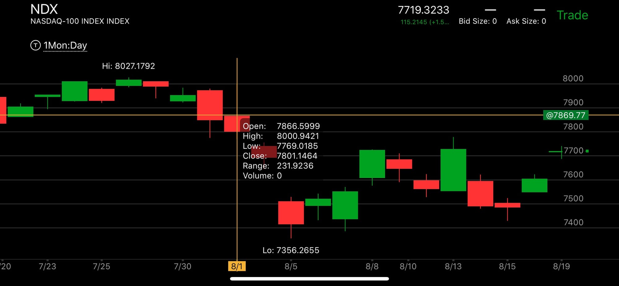 Three trading days later, it was up 370 points back above 7726 (+5%). Into the August 8 highs, I trimmed our longs and reloaded puts again (Trade Alert: SEDG’s up 500%, Reloading puts, A little trimming).