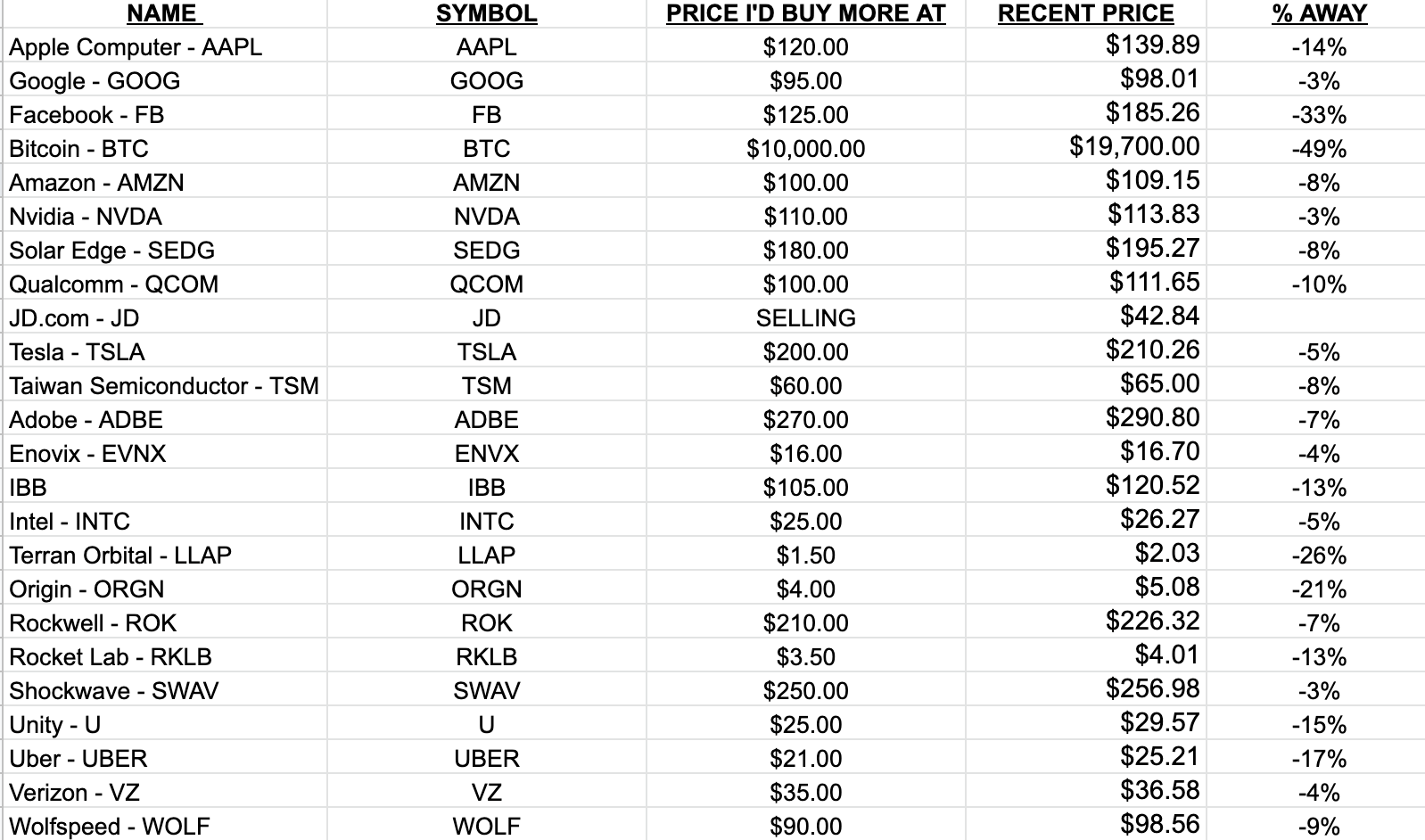 I had a few typos on that recent “Where I’d Buy More” spreadsheet because I was rushing it out to get to an appointment that day and I apologize. I have people who offer to edit my posts before I send them out but by the time I write these things up, I want to get it out to you as fast as possible, especially if it’s when the markets are open. Anyway, some of the stocks hit the levels I’d buy more at the very next day after I sent out that post I think, although this week has become a blur by now as the gyrations intraday and day-to-day have been exhausting for a hedge fund manager.