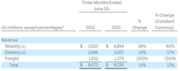 UBER – Uber missed slightly on revenue (-1.16% v consensus) but had a nice beat on earnings (beat 49.85%). Revenue growth slowed to 14% YoY in large part due to a 30% drop in Freight revenue. Excluding the freight decline, Uber’s core Mobility and Delivery businesses still grew substantially as shown below: