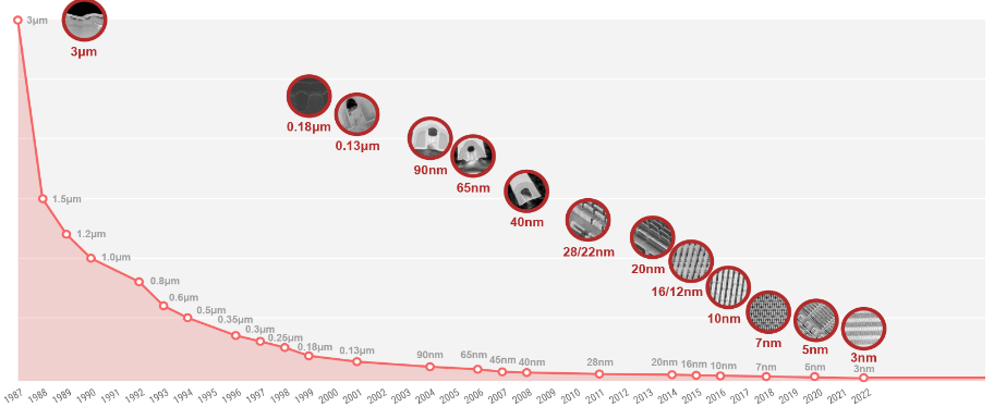 EUV is a fascinating technology and there is a reason that no other chip equipment maker (aka SemiCap) like Lam Research (LRCX) or Applied Materials (AMAT) has been able to offer a competitor to ASML’s EUV machines. Moore’s law predicts that more and more transistors get crammed onto the same area of silicon, and that happens by making the size of the transistors smaller. At TSMC (TSM) for example, the company’s first chips were produced on a 3 micron (3000nm) process node in 1987, today, TSMC’s leading technology is made using 3nm technology. That’s three orders of magnitude of improvement in 37 years.