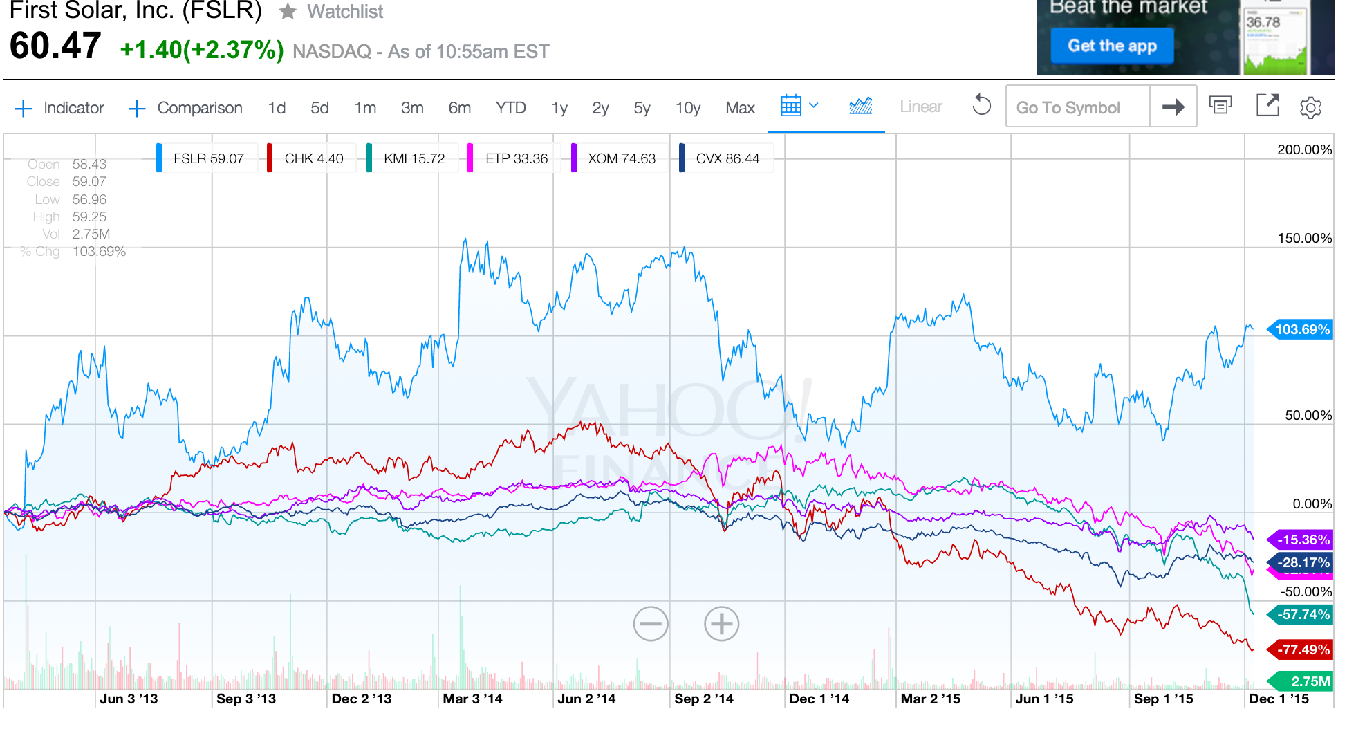 With energy and oil prices and stocks having crashed in the last couple years, do you realize that in First Solar FSLR we own the one energy stock that might be just about one of only a handful out of hundreds that is up nicely over the last few years? Our timing in flipping from Bear/Short to Bull/Long in the alternative energy sector in 2013 when company after company was going bankrupt and then buying FSLR, the solar stock with the single strongest balance sheet and prospects, has been a boon for us. I’m still expect there’s some long-term upside in First Solar in coming years regardless of what happens with the price of oil and energy, just as there has been for the last two and a half years while we’ve owned it as oil and energy prices and stocks crashed.