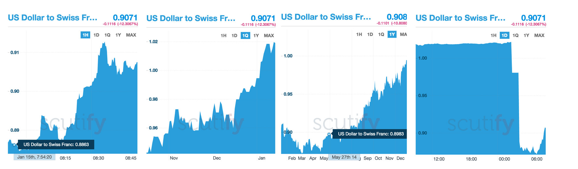 Scutify Chart(s) of the Day: Amazing how similar the 1 hour, 1 quarter and 1 Year charts of the US Dollar vs. the Swiss Franc are. No so for the 1-day chart tho. Anyway, this is all about the currency wars and these types of dislocations in a currency market are likely to have some huge ramifications for some companies’ earnings, for some of the large casino banks, for hedge funds and for economies at large.