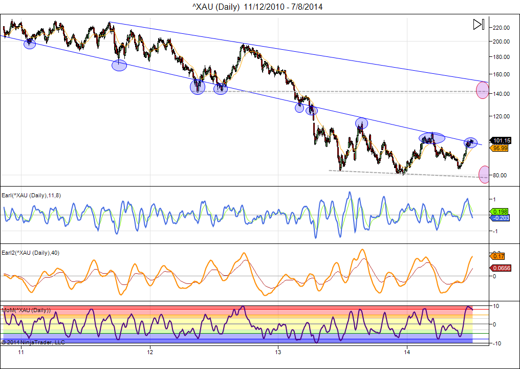 Gold stocks (XAU index) are also sitting at major resistance level near 100. Waiting for a breakout to the upside. If so then 140 becomes the target (= 40-50% upside potential). To the downside ~80.