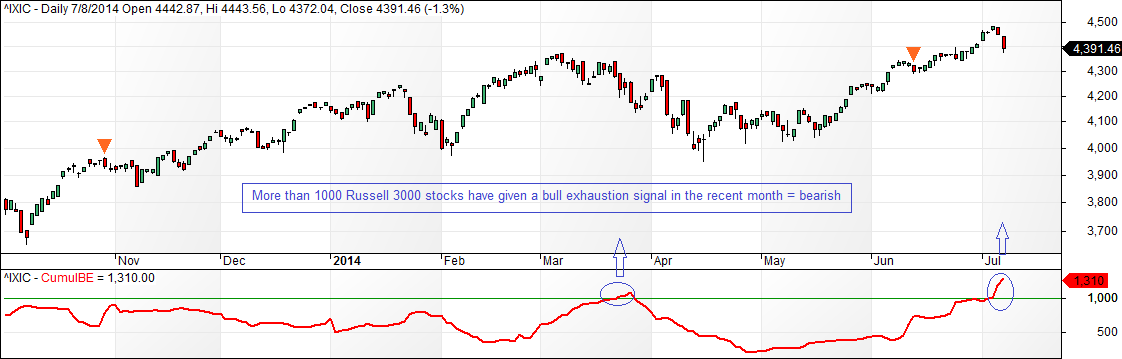 Another 113 stocks gave bull exhaustion signals yesterday, bringing the running monthly total to a very high 1310 = worse than mid March. Buy an umbrella or find shelter. #thistoowillpass