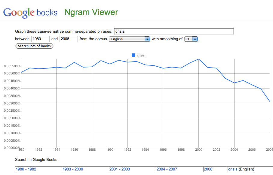 Here’s the frequency of occurrence of the word “crisis” over the last twenty years: