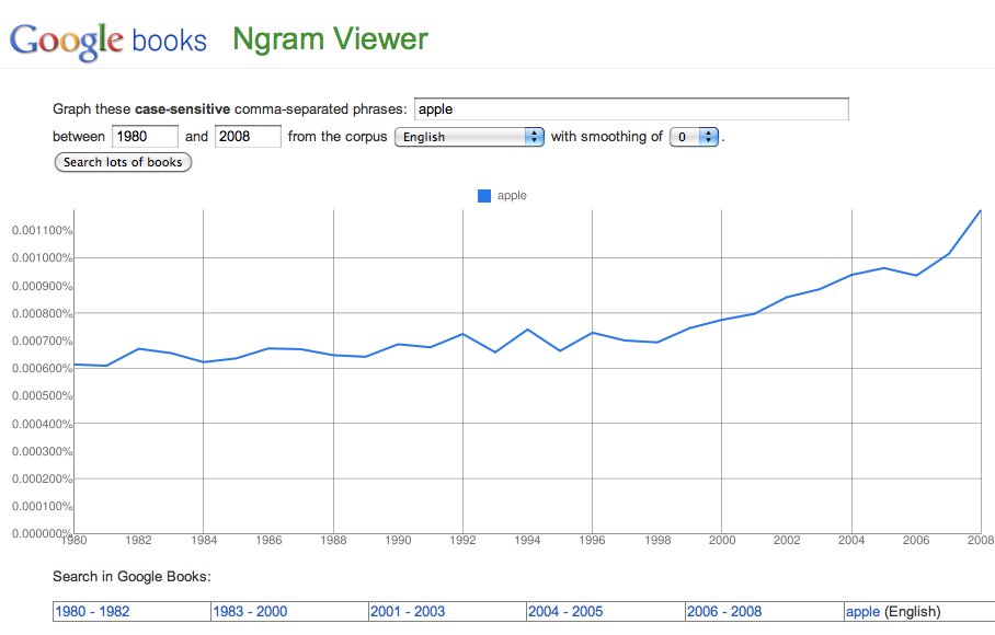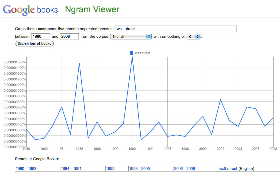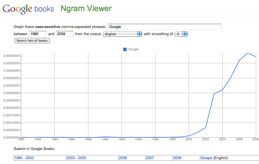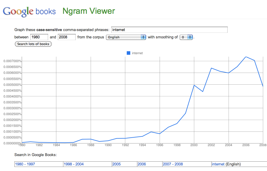 Interesting how volatile both of those charts of “Wall Street” are and how the last 20 years has been so steady despite the dot-com bubble and other crazy times, huh?Want to know some word trends that are looking like they’re very early in their own growth phases? Here’s the word “Internet” and its frequency of appearance in published books over the last couple decades: