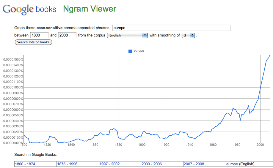 Do you see how society has increasingly worried over “crisis” for the last 200 years steady? And that for the last twenty years there’s been little change or even a decrease in that frequency of worry over “crisis” in our published literature?Let’s compare the trends of the word “crisis” in our books with a bit of a control word, such as “Europe”. Here’s the frequency with which the word “Europe” has appeared in books over the last 200 years: