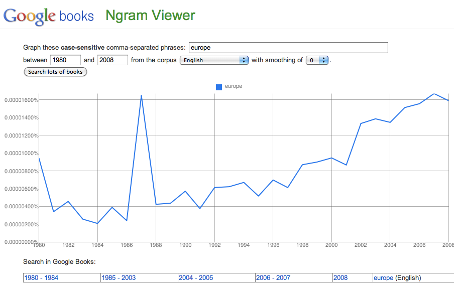 Here’s the frequency of occurrence of the word “Europe” over the last twenty years: