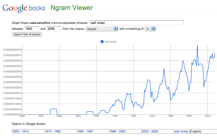 That “Europe” word has shown steady growth in our culture’s books for the last 200 years and that growth really took off back in 2000 when the EU and Euro were kicking in. And our stock markets and economy were topping.How about the words “Wall Street” showing up in our literature? The last 200 years: