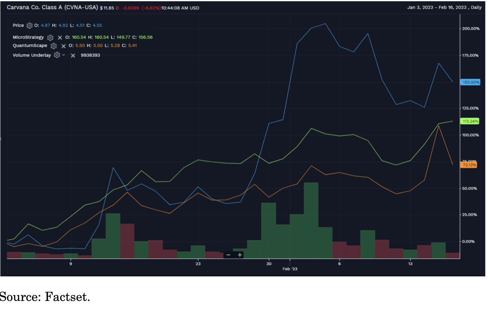 The year 2022 ended with the S&P 500 posting a 19% decline (the biggest pullback since 2008), the DJIA down 8.8%, and the Nasdaq down a whopping 33%. Yet 2023 started off with a quick reversal with the Nasdaq already up around 15% year to date. More notably, many of the most heavily-shorted stocks (some of which are truly fraudulent and/or soon to be bankrupt companies) are up even more (Carvana is up around 150% ytd). Here is a year to date chart of CVNA, FSR, and MSTR:
