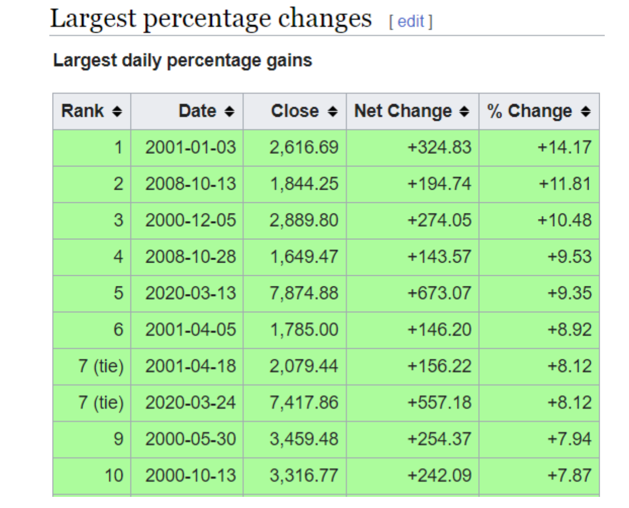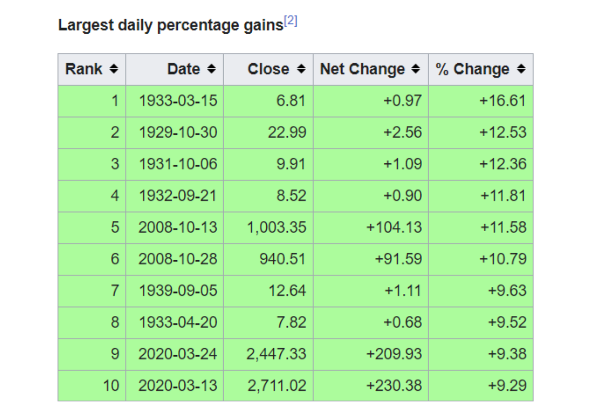 On Wall Street, the rooster(s) are stock prices. It seems that the “experts” are confused this rally in stock prices with health in the underlying economy. I mean, if stocks are going up, can things really be that bad? Here is a chart from Wikipedia showing the 10 largest one-day advances in the Nasdaq Composite throughout history:
