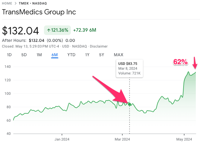 A Trading with Cody "Trade Alert" went out on March 8, 2024, with a full writeup, when it was at $83. It closed on May 13 at $132.