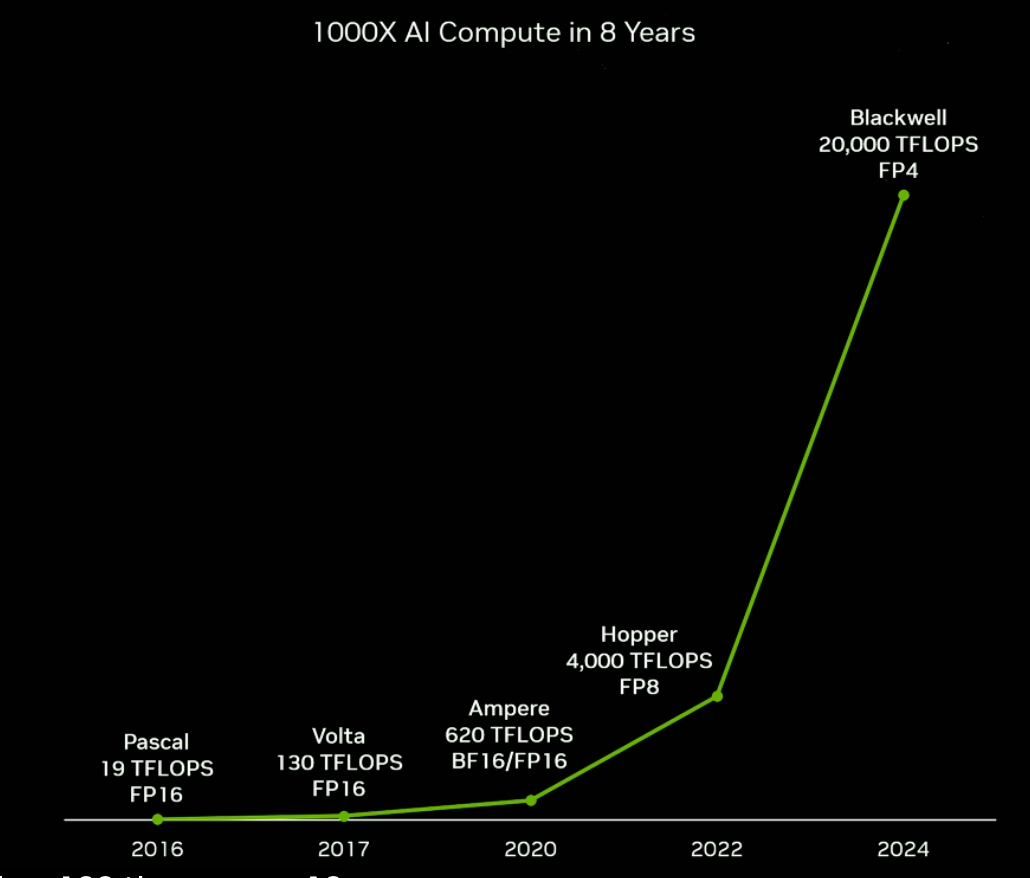 The point is that even though Jensen Huang predicted that Moore’s Law was dead because of the physical limitations involved when trying to place ever more transistors on the same area of silicon, his company actually accelerated the rate of growth in computing power by re-engineering the way computers work from the ground up. So even physics itself cannot stop the exponential growth of technology.